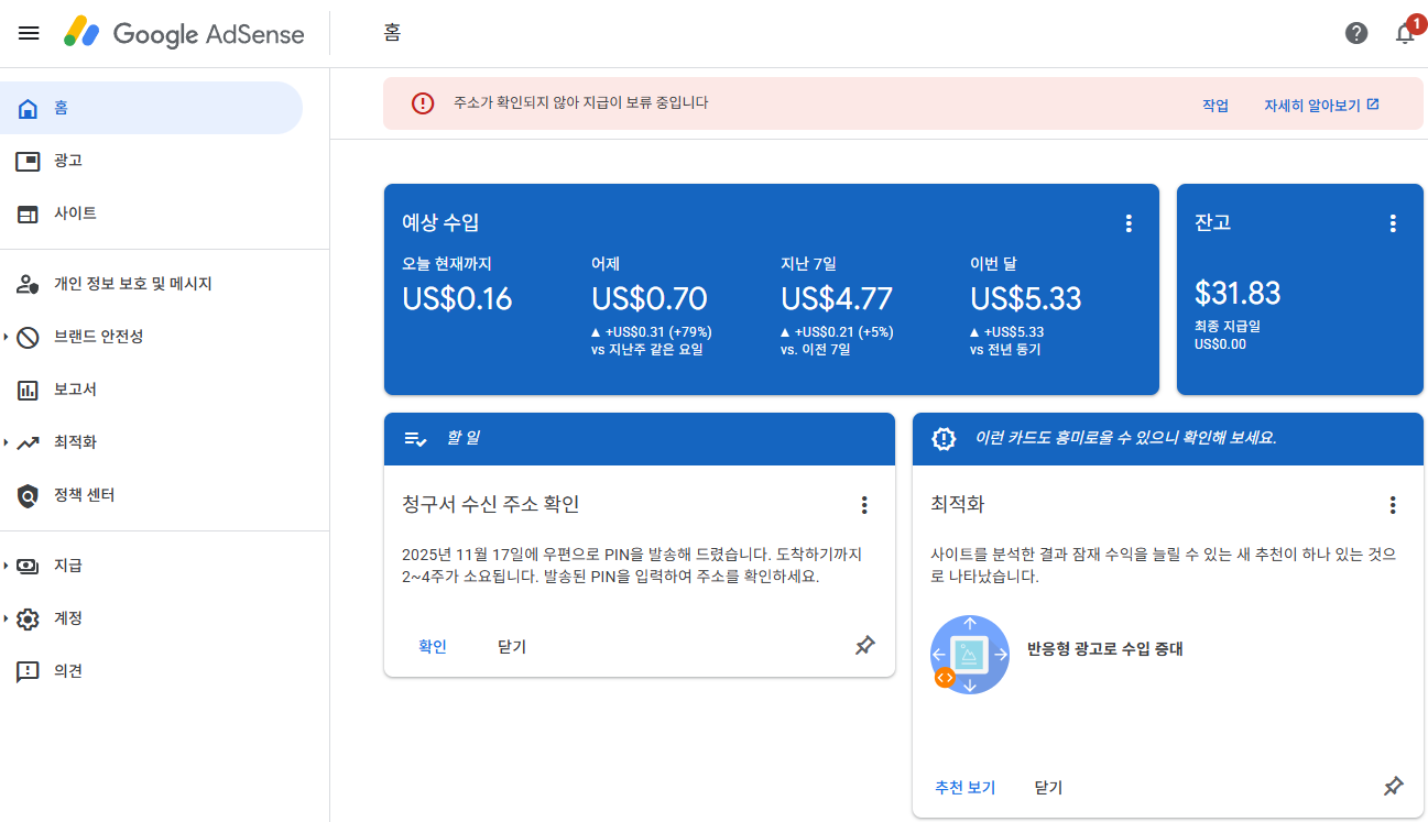 본인이 애드센스 가입 시 입력한 주소로 우편이 발송되게 되며,
