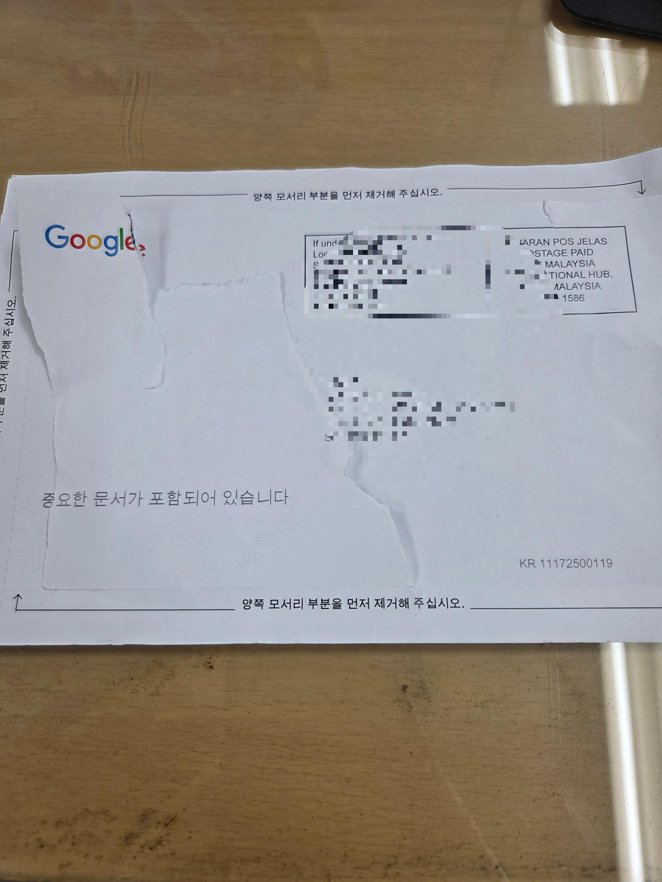 구글에서 보내온 우편이 예상대로 약 3주 뒤에 도착했습니다.