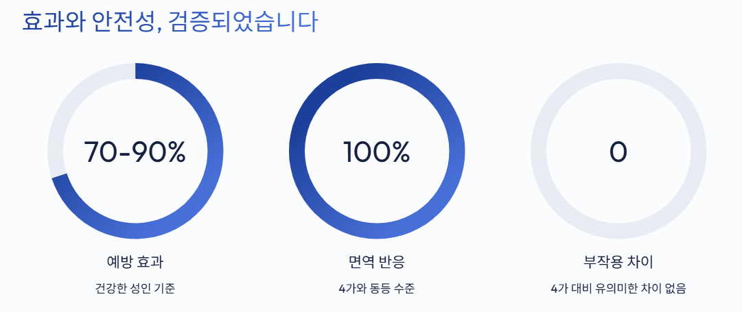 또한 건강한 성인을 기준으로 예방효과는 70~90% 수준이며, 코로나19 백신과 동시에 접종해도 문제가 없다고 안내하고 있습니다.