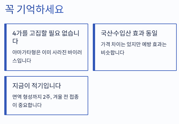 정부가 바뀐 정책을 바탕으로 충분히 검토해 권고하는 만큼, 이번 겨울도 3가 백신으로 안전하게 대비하시길 바랍니다.