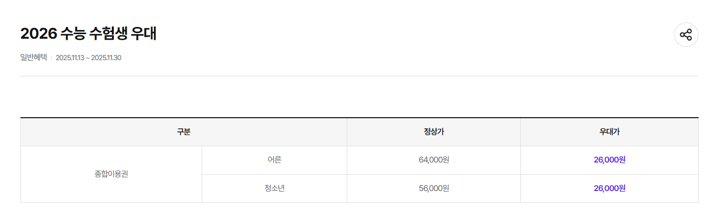 그래서 준비된 2026 수능 수험생 우대 혜택 이벤트!단 수험표 하나면 26,000원에 종합이용권을 즐길 수 있는 절호의 기회예요.