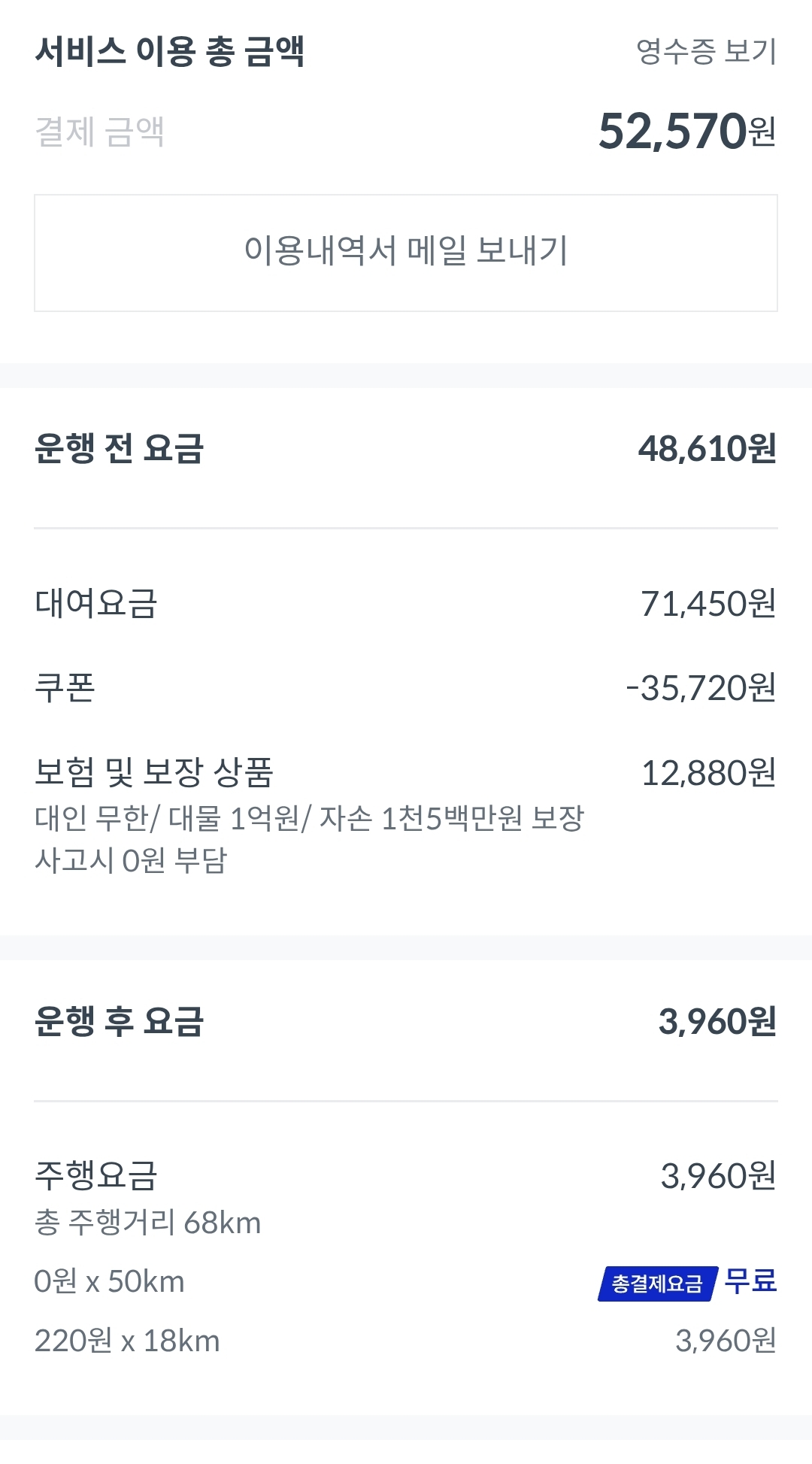 - ⛽ 주행거리 요금: 약 3,960원 (무료 50km 초과분)