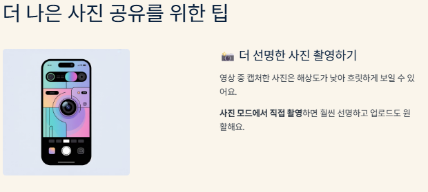 - 사진 흐릿하게 보이는 문제는 영상 촬영 중 캡처된 사진이 원래 해상도가 낮기 때문인 경우가 많아요. 가능하면 아예 사진 모드에서 찍는 게 훨씬 선명하고 업로드도 잘 됩니다 😊