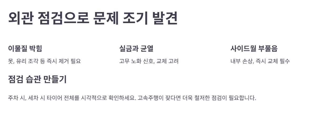 타이어의 외관을 자주 확인하는 습관도 중요합니다. 타이어에 못이 박히거나 유리 조각이 박혀 있는 경우, 또는 옆면에 실금이나 균열이 생긴 경우, 더 나아가 사이드월이 부풀어오른 경우 등은 모두 심각한 문제로 이어질 수 있는 신호입니다.