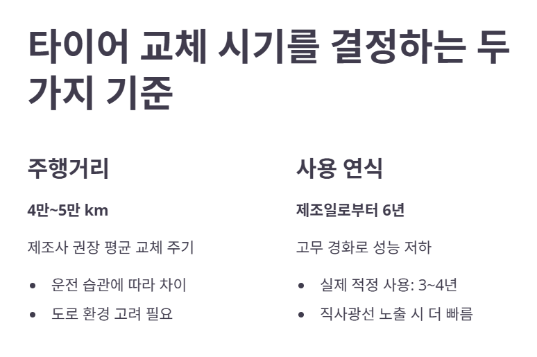 타이어 교체시기를 판단하는 기준은 크게 두 가지, ‘주행거리’와 ‘연식’입니다. 일반적으로 4만km에서 5만km를 주행한 타이어는 교체를 고려해야 합니다. 물론 운전 습관이나 도로 환경에 따라 달라질 수 있지만, 이 수치는 제조사에서 권장하는 평균적인 교체 주기입니다.