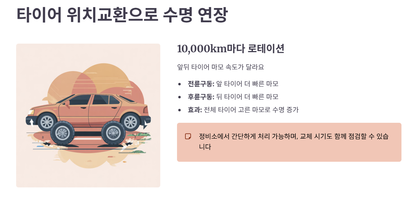 전륜구동 차량은 앞 타이어가 더 빨리 닳고, 후륜구동은 뒤 타이어가 더 빨리 닳는 경향이 있어 차량 특성을 고려해 위치교환을 진행해야 합니다. 정비소를 방문하면 간단하게 처리할 수 있으며, 타이어 교체 시기도 함께 점검할 수 있어 일석이조의 효과를 누릴 수 있습니다.