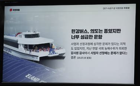 최근 국회 국정감사에서는 한강버스 운영과 관련해 서울시 재정 부담 논란이 있었지만, 서울시는 “법적·절차적 문제 없다”고 반박했습니다. 이에 따라 정치적 논란과는 별개로 시민 교통 편익을 최우선으로 운항을 재개한다고 밝혔습니다.