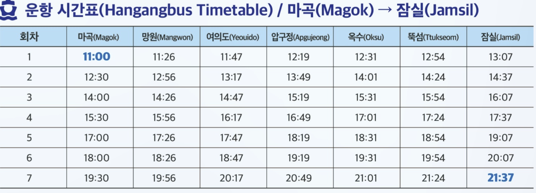 - 운항 횟수: 하루 16회 (1시간 30분 간격, 주중·주말 동일)