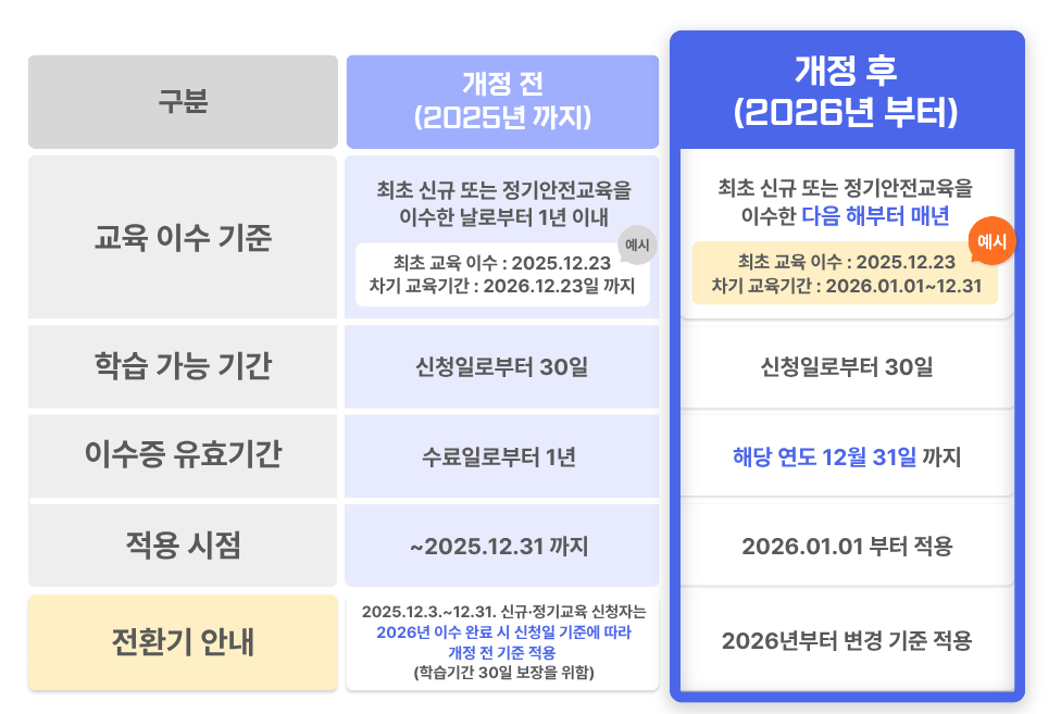 A. 보통 1년 주기로 이수해야 하며, 만료 전에 미리 수강하는 것이 안전합니다.