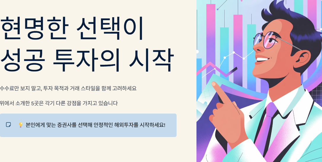 해외주식계좌 추천을 받을 때는 단순히 수수료만 보는 것이 아니라, 본인의 투자 목적, 거래 스타일, 선호하는 국가를 함께 고려하는 것이 중요합니다. 위에서 소개해드린 5곳은 각기 다른 강점을 가지고 있으니, 나에게 맞는 증권사를 선택해 안정적인 해외투자를 시작해보시길 바랍니다.