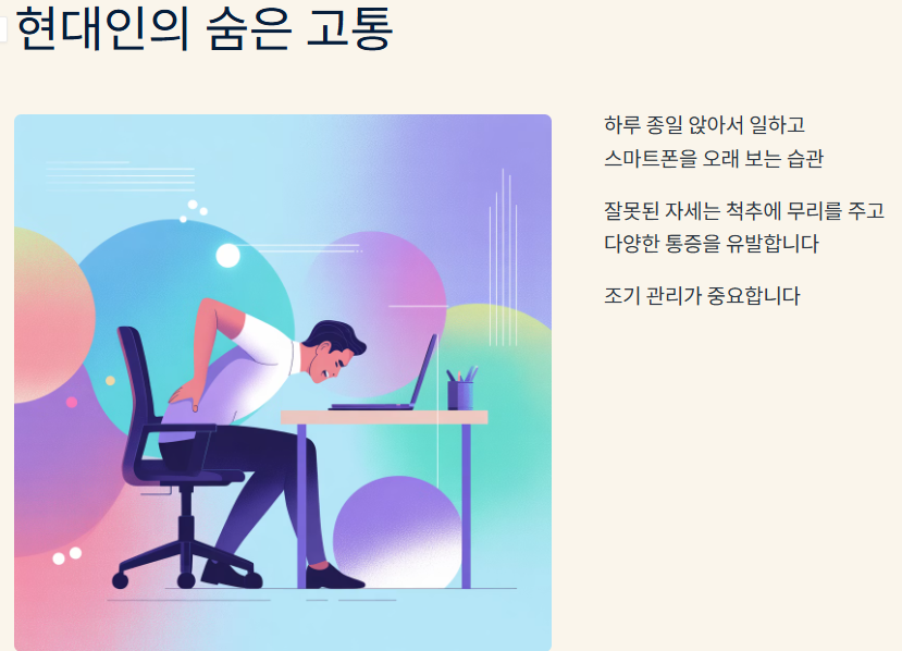 허리통증은 현대인에게 매우 흔한 증상입니다. 하루 종일 앉아서 일하거나 스마트폰을 오래 보는 습관, 잘못된 자세는 허리디스크, 요추염좌, 근육긴장 등 다양한 원인의 통증을 유발할 수 있습니다. 허리통증을 방치하면 만성으로 이어지기 쉬워 조기 관리가 중요합니다.