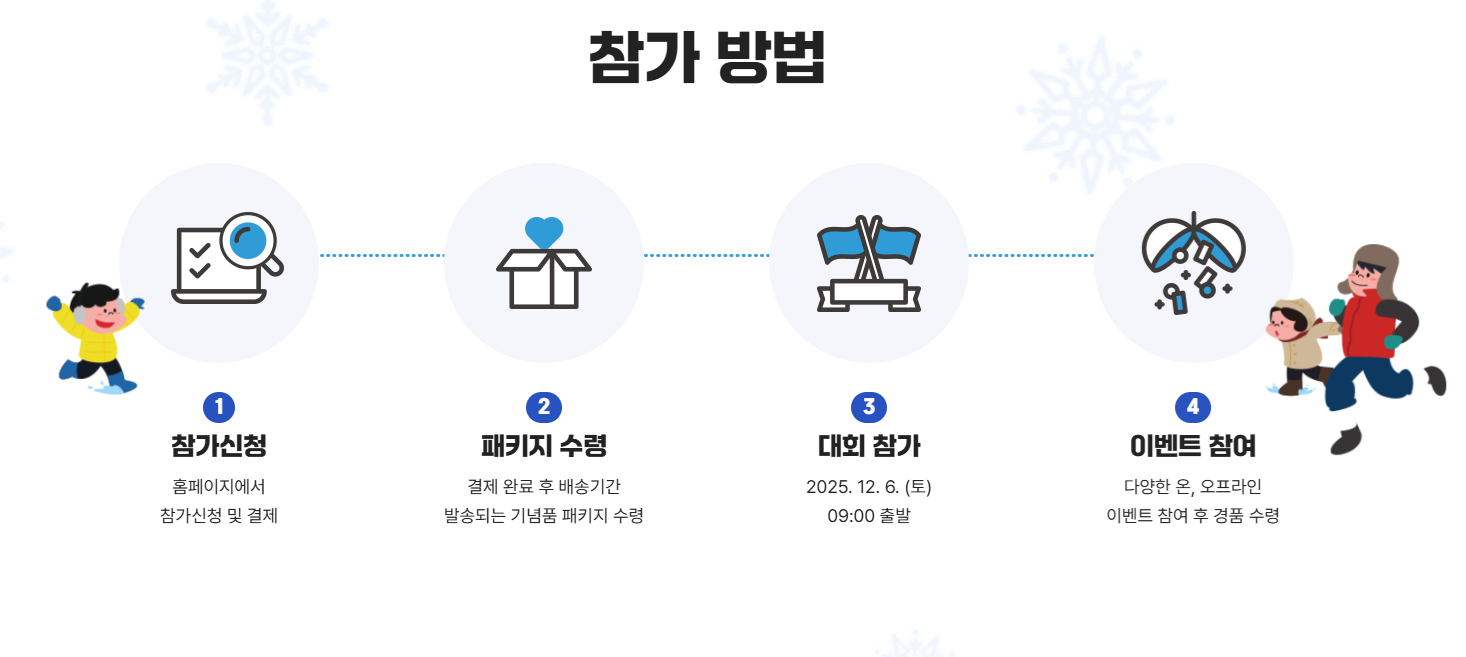 다가오는 2025년 12월 6일 토요일, 겨울의 낭만과 건강을 동시에 챙길 수 있는 특별한 이벤트! 바로 2025 겨울왕국 레이스가 개최됩니다. 하지만! 너무 많은 관심으로 인해 접수는 조기 마감되었으니 아쉽게도 이번엔 참여가 어렵습니다 😢