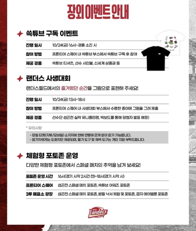 또한 경기장 내외부에는 여러 체험형 이벤트존이 운영됩니다. 대표적으로는 깜자 캐릭터 대형 에어벌룬이 설치되어 포토존 역할을 하며, SSG 랜더스의 공식 유튜브 채널 ‘쓱튜브’를 주제로 한 어워즈 포토존, 자유롭게 낙서를 남길 수 있는 분필 포토존도 마련돼 가족 단위 관람객들도 즐겁게 체험할 수 있도록 구성됐습니다.