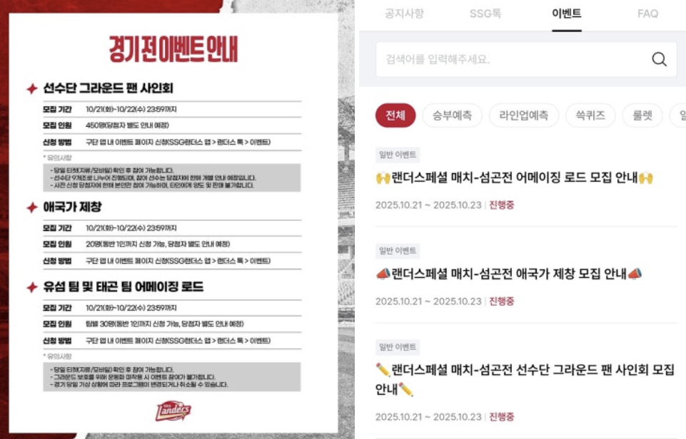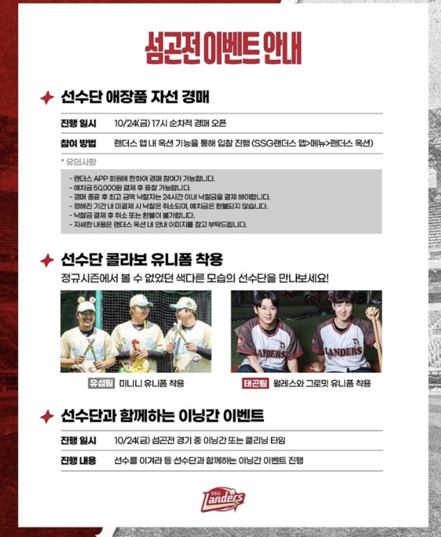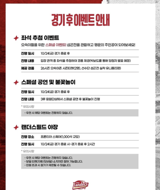또한, 다양한 포토존과 사인회가 경기 전부터 운영되므로 가급적 일찍 입장해 현장을 여유롭게 즐기는 것을 추천드립니다. 이번 경기는 팀별 응원전도 포함되어 있기 때문에 한유섬 팀과 오태곤 팀 중 어느 쪽을 응원할지 미리 선택해두는 것도 더욱 재미있게 즐길 수 있는 방법입니다.