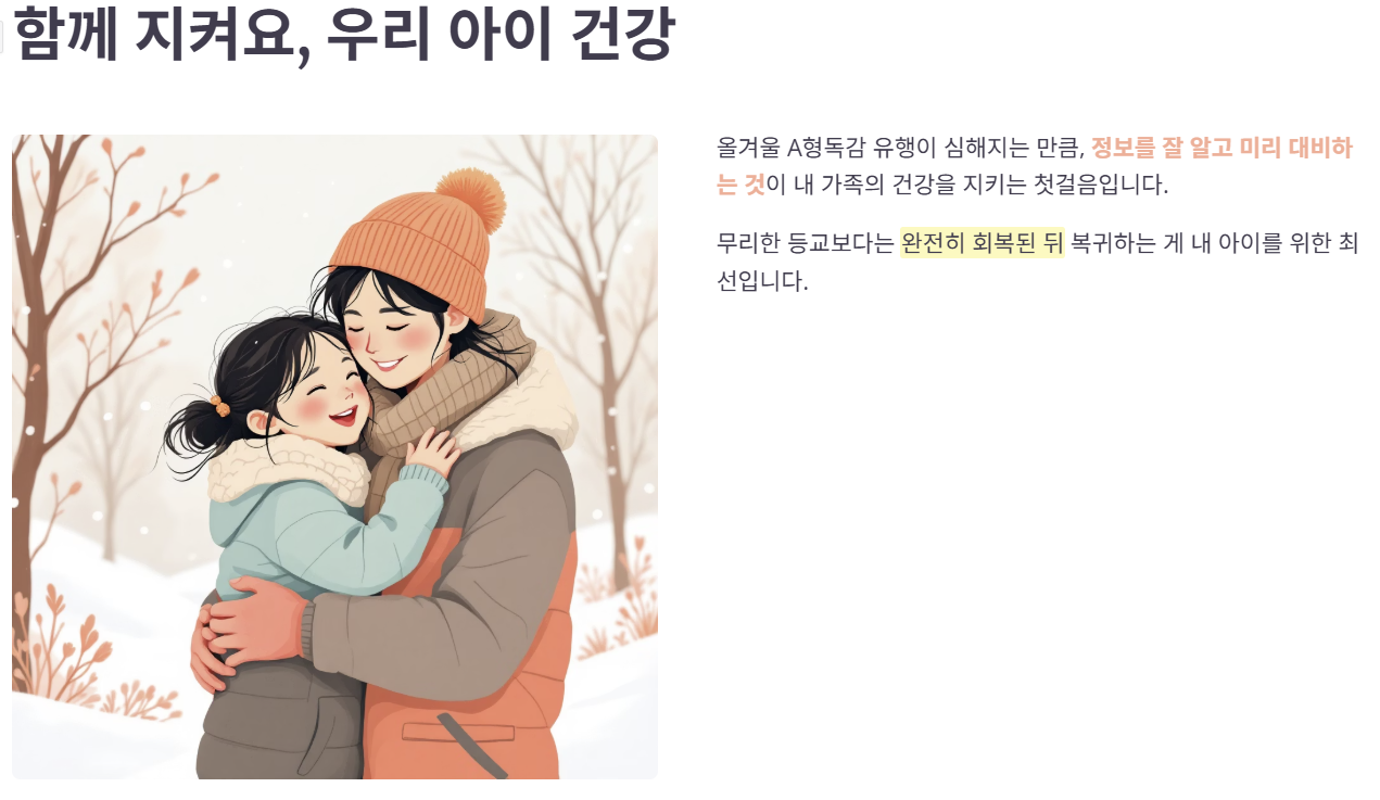 올겨울 A형독감 유행이 심해지는 만큼, 정보를 잘 알고 미리 대비하는 것이 내 가족의 건강을 지키는 첫걸음입니다.